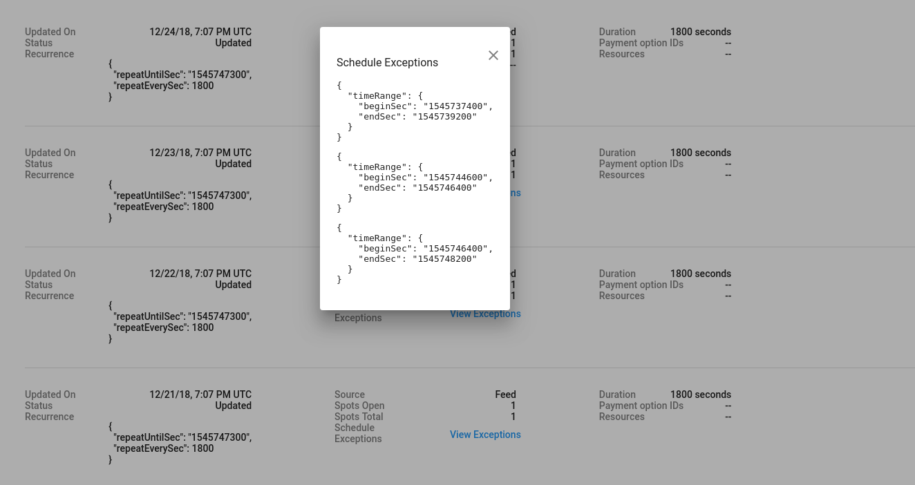 | إلغاء قواعد تحديد المواعيد | البيانات الوصفية ذات الصلة بقواعد تحديد المواعيد، مثل آخر ثانية قابلة للحجز وأول ثانية قابلة للحجز |