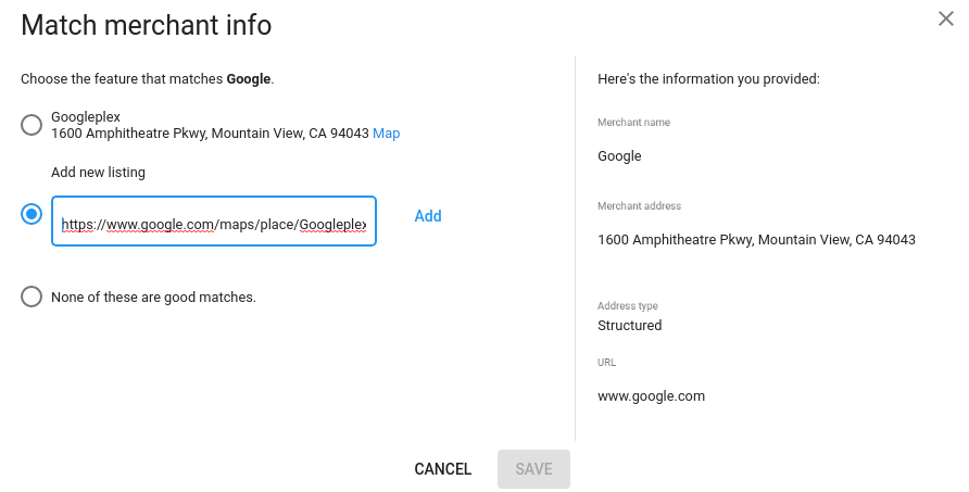 如需优化与商家的匹配,请在合作伙伴门户中为 Google 地图上的商家信息提供网址建议。建议中心将根据相应建议创建新的匹配候选项。
