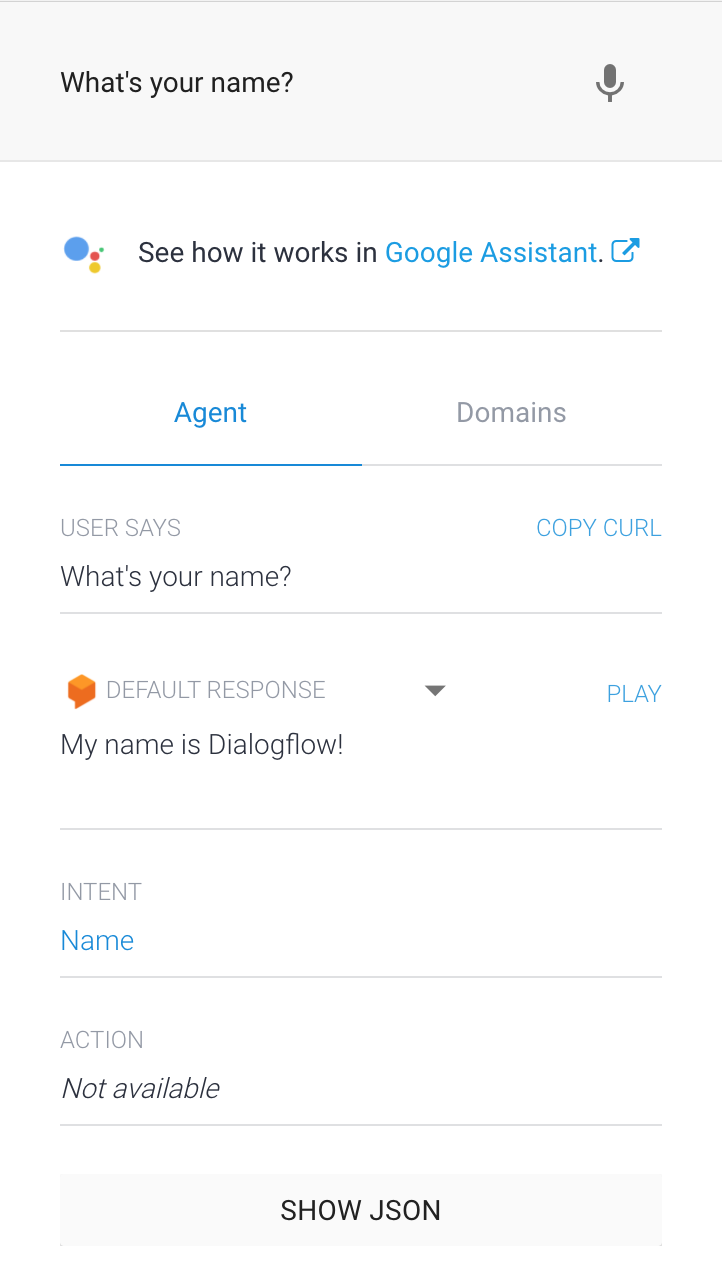 Aby przetestować nową intencję Name, w symulatorze Dialogflow wpisz „What's your name?” (Jaka jest Twoja nazwa?) i naciśnij Enter.