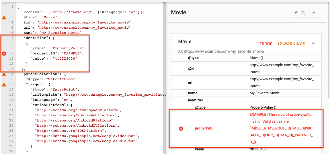 @contextdisetel dengan benar. Tetapkan"@context": "http://schema.org"untuk Tindakan Tonton dan"@context": "http://schema.googleapis.com"untuk Tindakan Mendengarkan.