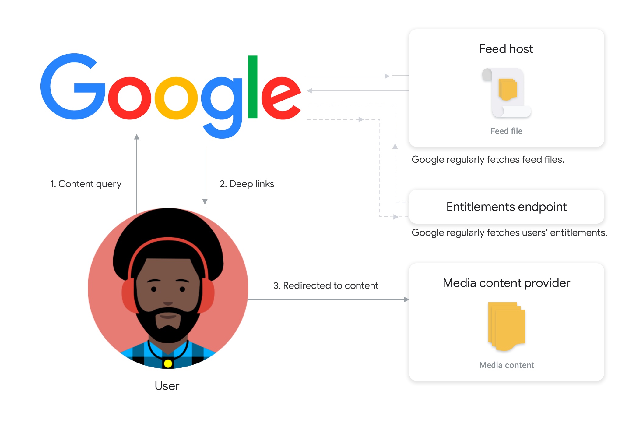 Nguồn cấp dữ liệu Hành động đa phương tiện cho phép bạn mô tả nội dung đa phương tiện cho Google. Điều này cho phép người dùng khám phá nội dung của bạn trên Google Tìm kiếm và Trợ lý Google, đồng thời bắt đầu phát nội dung ngay trên ứng dụng hoặc nền tảng của bạn.
