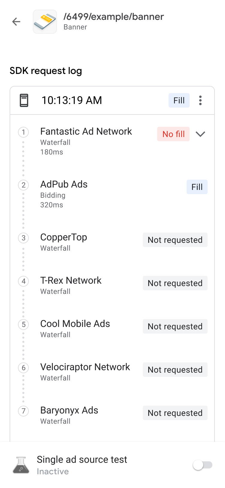 Tippen Sie auf dem Tab Anzeigenblöcke auf einen Anzeigenblock, um das SDK-Anfrageprotokoll aufzurufen. Im SDK-Anfrageprotokoll finden Sie Details zur Vermittlungsabfolge ab der Anzeigenanfrage, z. B. wann die Anzeige ausgeliefert wurde, von welcher Anzeigenquelle sie stammt oder ob die Vermittlungsabfolge ohne Auslieferung beendet wurde.