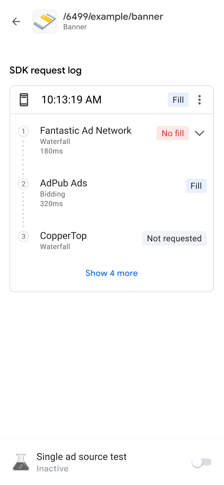 Unter SDK-Anfrageprotokoll sehen Sie die Bidding-Anzeigenquellen, die in einer Anzeigenanfrage aufgerufen wurden. Wenn Sie die Details der einzelnen Anzeigenquellen in der Bidding-Auktion aufrufen möchten, tippen Sie auf more_vert und dann auf Alle Bieter ansehen: