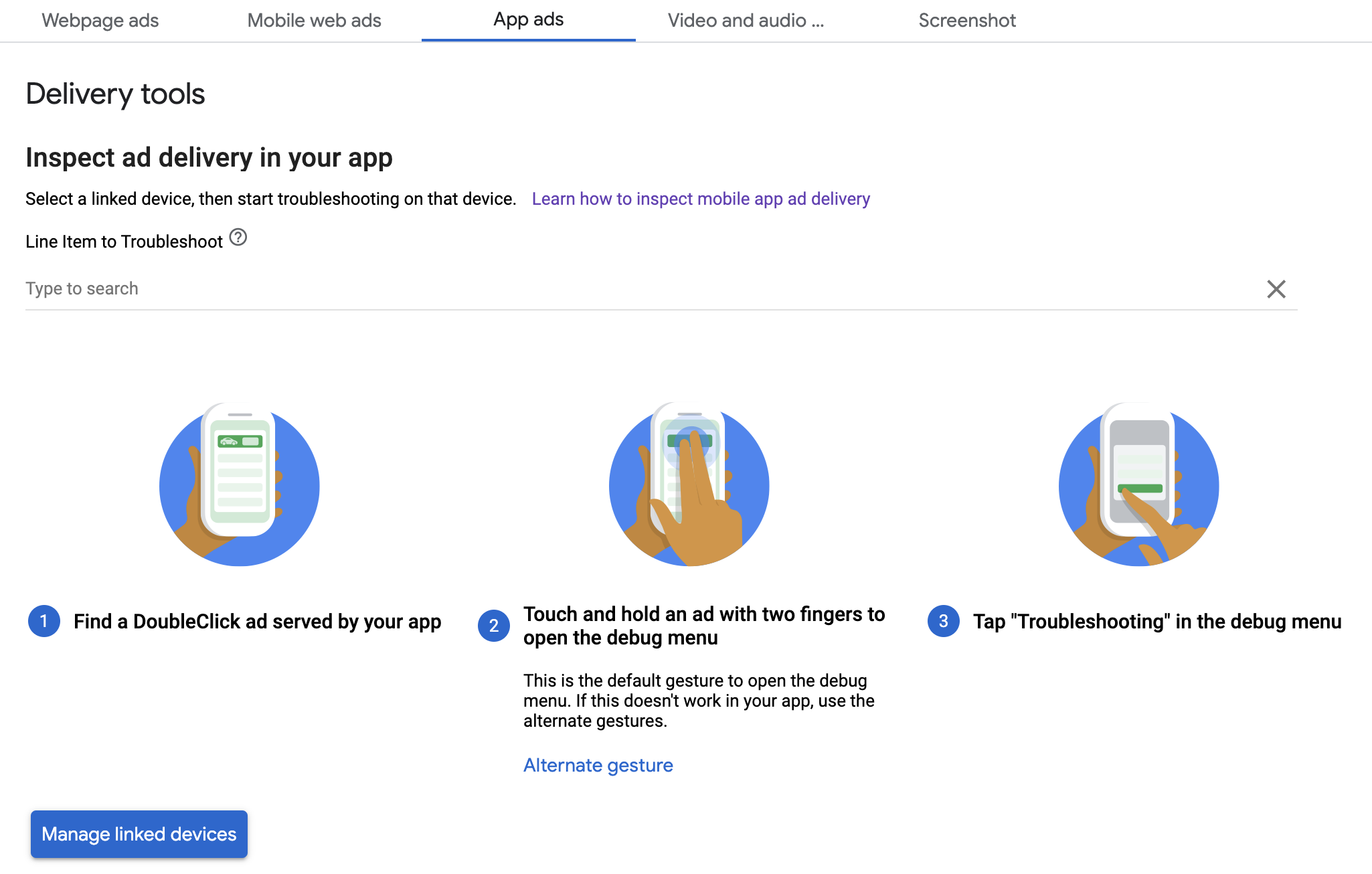 이 가이드에서는 인앱 미리보기 및 Ad Manager 게재 도구를 사용하여 광고 게재를 디버깅하는 방법을 보여줍니다.