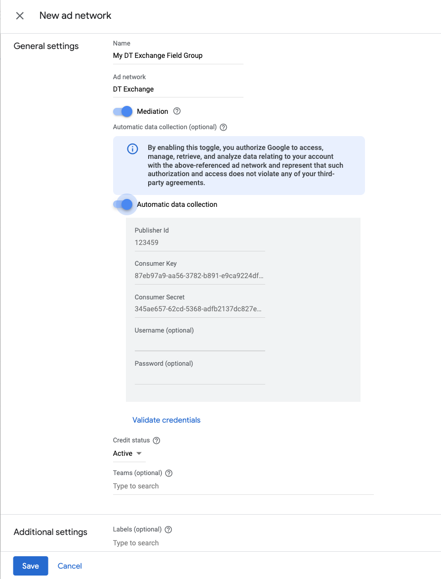 [広告ネットワーク] で [DT Exchange] を選択し、一意の名前を入力して、[メディエーション] を有効にします。[データの自動収集] をオンにして、前のセクションで取得したパブリッシャー ID、コンシューマー シークレット、コンシューマー キーを入力します。