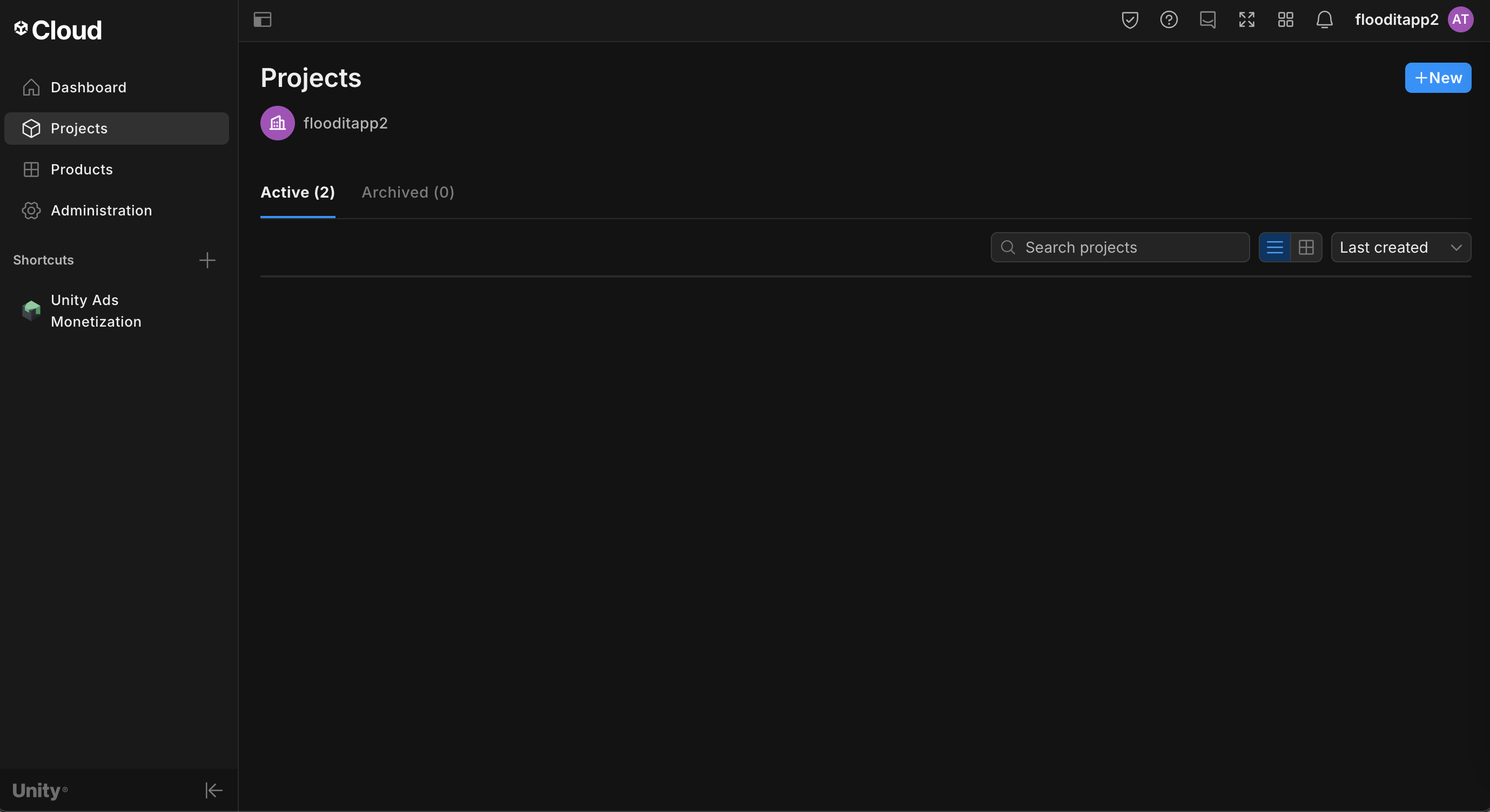 Nella dashboard di Unity Ads, vai a Progetti e fai clic su Nuovo.
