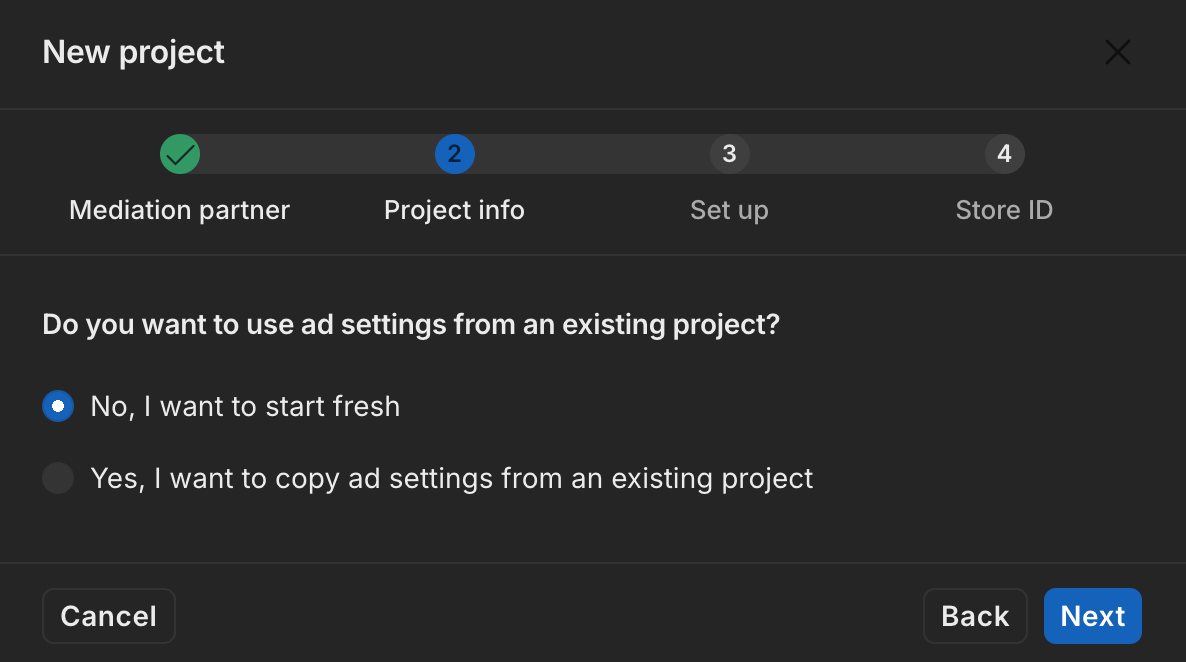 Nella finestra modale Nuovo progetto, seleziona Utilizzerò la mediazione e Google AdMob per Partner di mediazione, poi fai clic su Avanti.