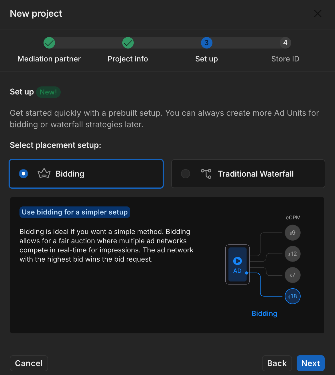 Fai clic su Continua per attivare SDK Bidding per questo offerente.