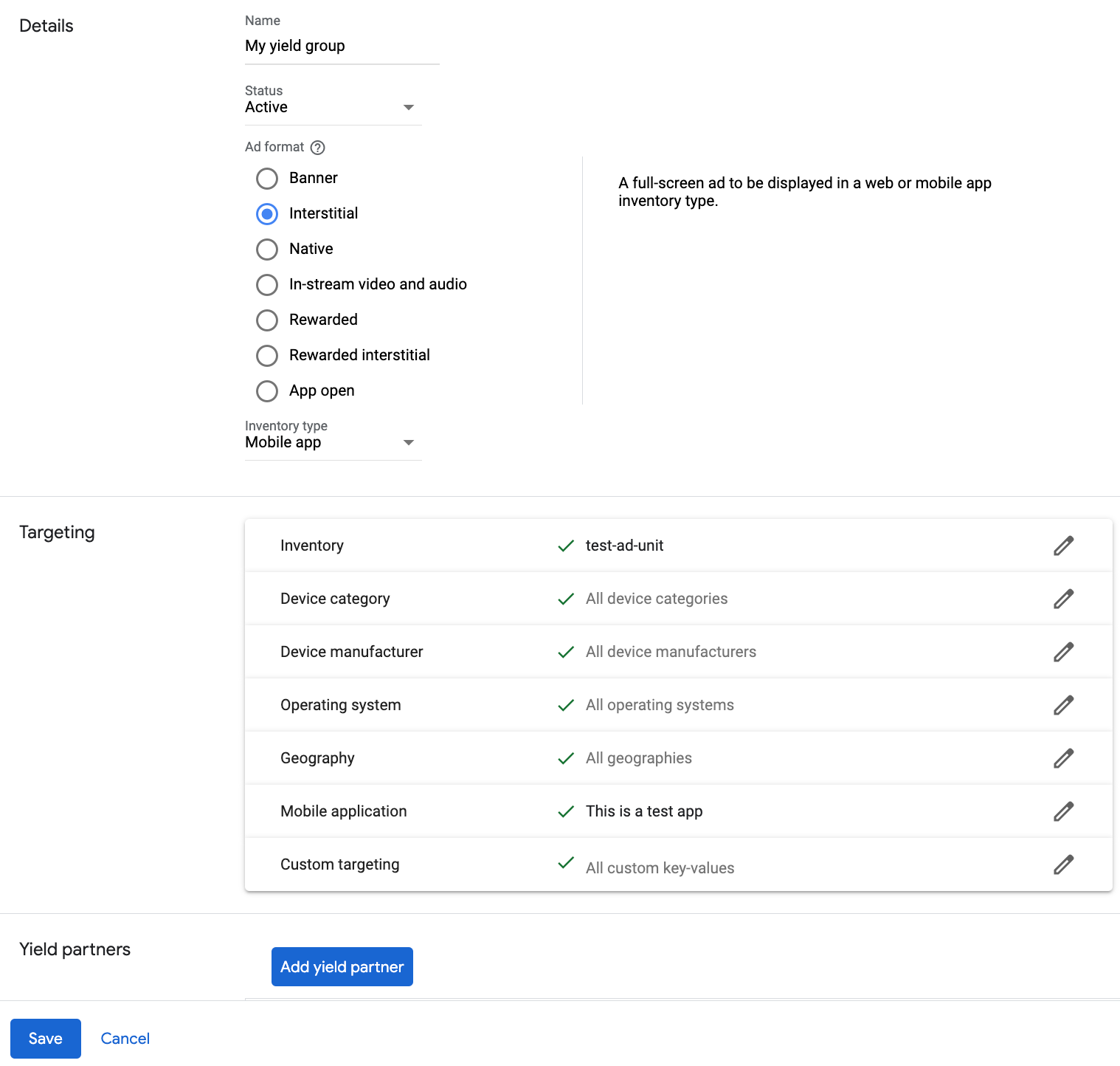 Вы можете принудительно включить тестовый режим для своего приложения, нажав кнопку редактирования рядом с Google Play Store , включив параметр «Переопределить тестовый режим клиента» и выбрав «Принудительно включить тестовый режим (т.е. использовать тестовую рекламу) для всех устройств» .