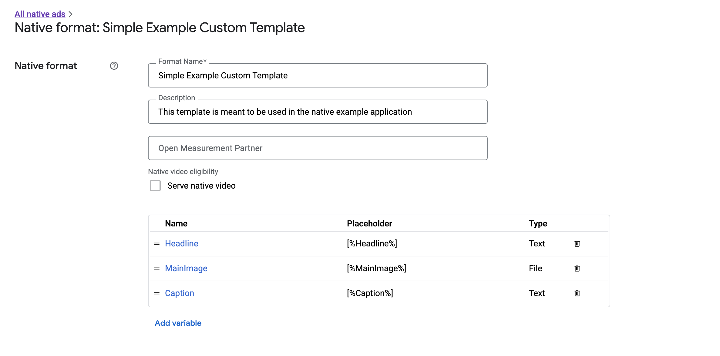 O ID do formato de cada anúncio nativo personalizado aparece ao lado do nome. Quando você clica em um dos nomes, é exibida uma tela com informações sobre os campos do formato: