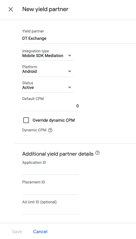 Önceki bölümde DT Exchange için oluşturduğunuz şirketi seçin. Entegrasyon türü olarak Mobil SDK uyumlulaştırması'nı, Platform olarak Android'i ve Durum olarak Etkin'i seçin.