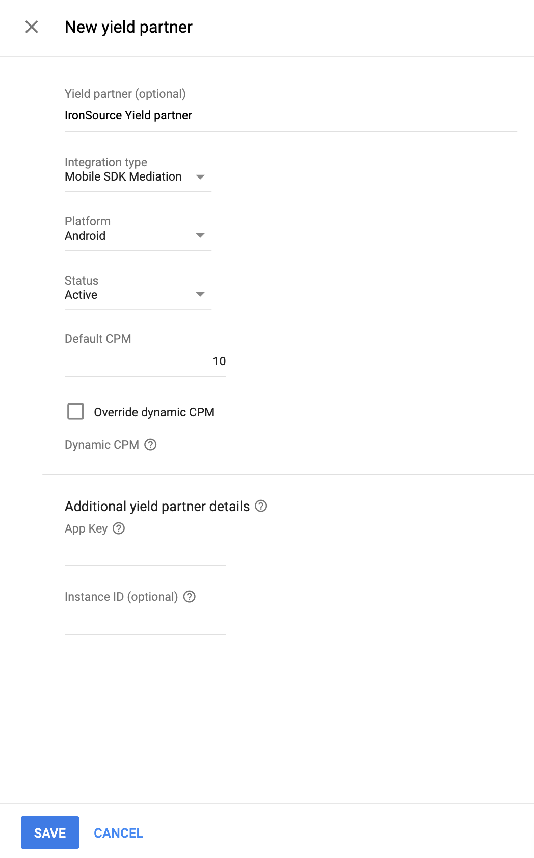بعد اختيار شريك إعلاني مدِّر للأرباح، اختَر التوسّط في حزمة تطوير البرامج (SDK) للأجهزة الجوّالة كـ نوع الدمج، وAndroid كـ النظام الأساسي، ونشط كـ الحالة. أدخِل مفتاح التطبيق ورقم تعريف المثيل الذي حصلت عليهما في القسم السابق. بعد ذلك، أدخِل قيمة تكلفة تلقائية لكل ألف ظهور.