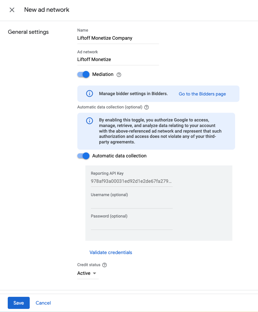בוחרים באפשרות Liftoff Monetize בתור רשת המודעות, מזינים שם ייחודי ומפעילים גישור. מפעילים את האפשרות איסוף נתונים אוטומטי ומזינים את מפתח Reporting API שהתקבל בקטע הקודם.