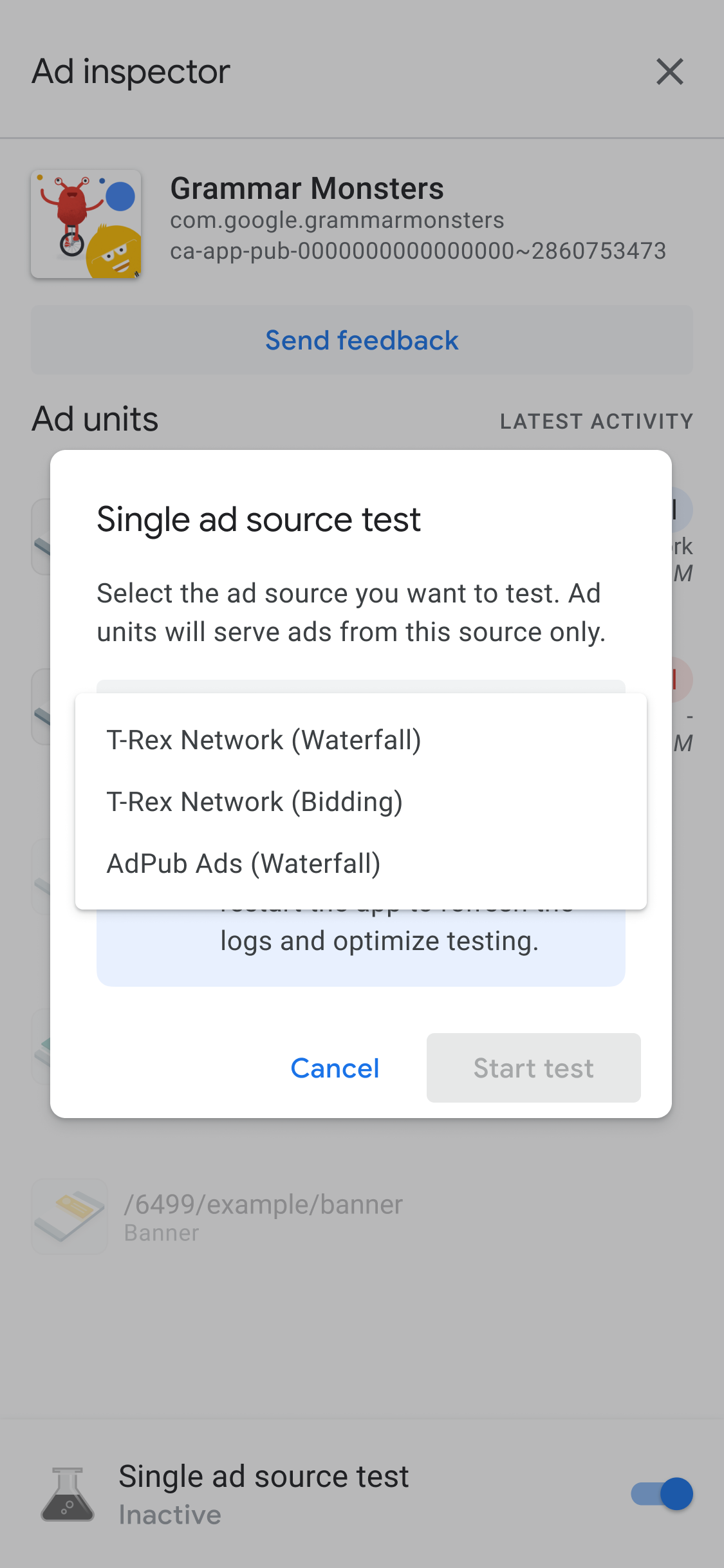 • Test fuori contesto: testa l'unità pubblicitaria direttamente nello strumento di controllo degli annunci senza navigare nell'interfaccia utente dell'app. Puoi testare più unità pubblicitarie contemporaneamente, caricare e visualizzare in modo asincrono le richieste di annunci di test ed eseguire test per una singola origine annuncio.