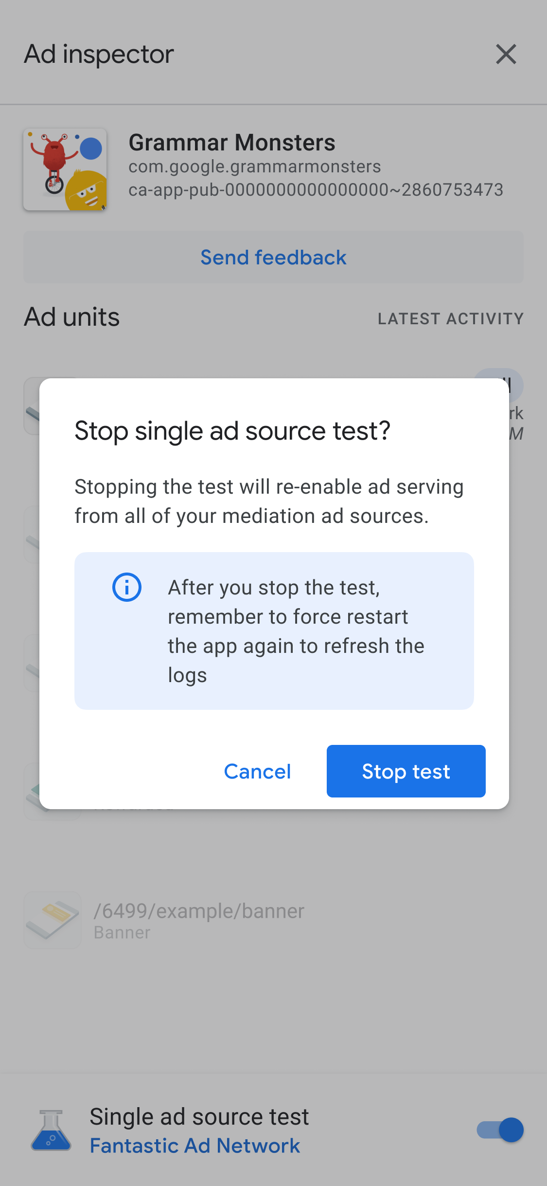 Test edilen reklam kaynağı için önbelleğe alınmış reklamları iptal etmek istiyorsanız testi durdurduktan sonra uygulamayı zorla yeniden başlatmanızı öneririz.
