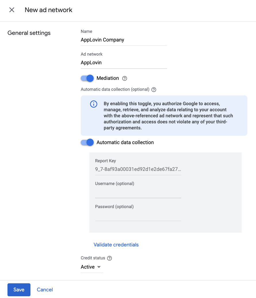 选择 AppLovin 作为广告联盟,输入唯一的名称,然后启用中介。 开启自动数据收集,然后输入在上一部分中获得的报告密钥