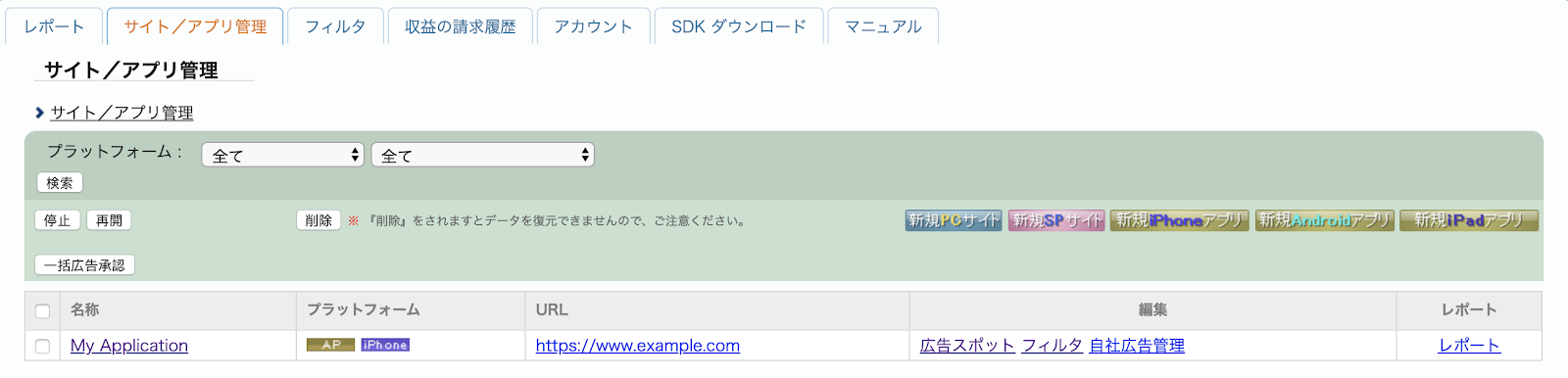 नया विज्ञापन स्पॉट बनाने के लिए, サイト/アプリ管理 (साइट/ऐप्लिकेशन मैनेजमेंट) टैब में जाकर अपना ऐप्लिकेशन चुनें.