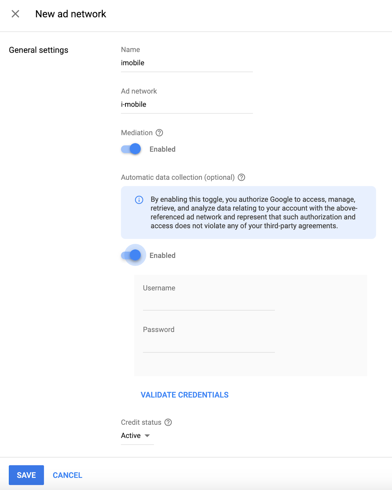 將「廣告聯播網」設為「i-mobile」,輸入專屬「名稱」,並啟用「中介服務」。