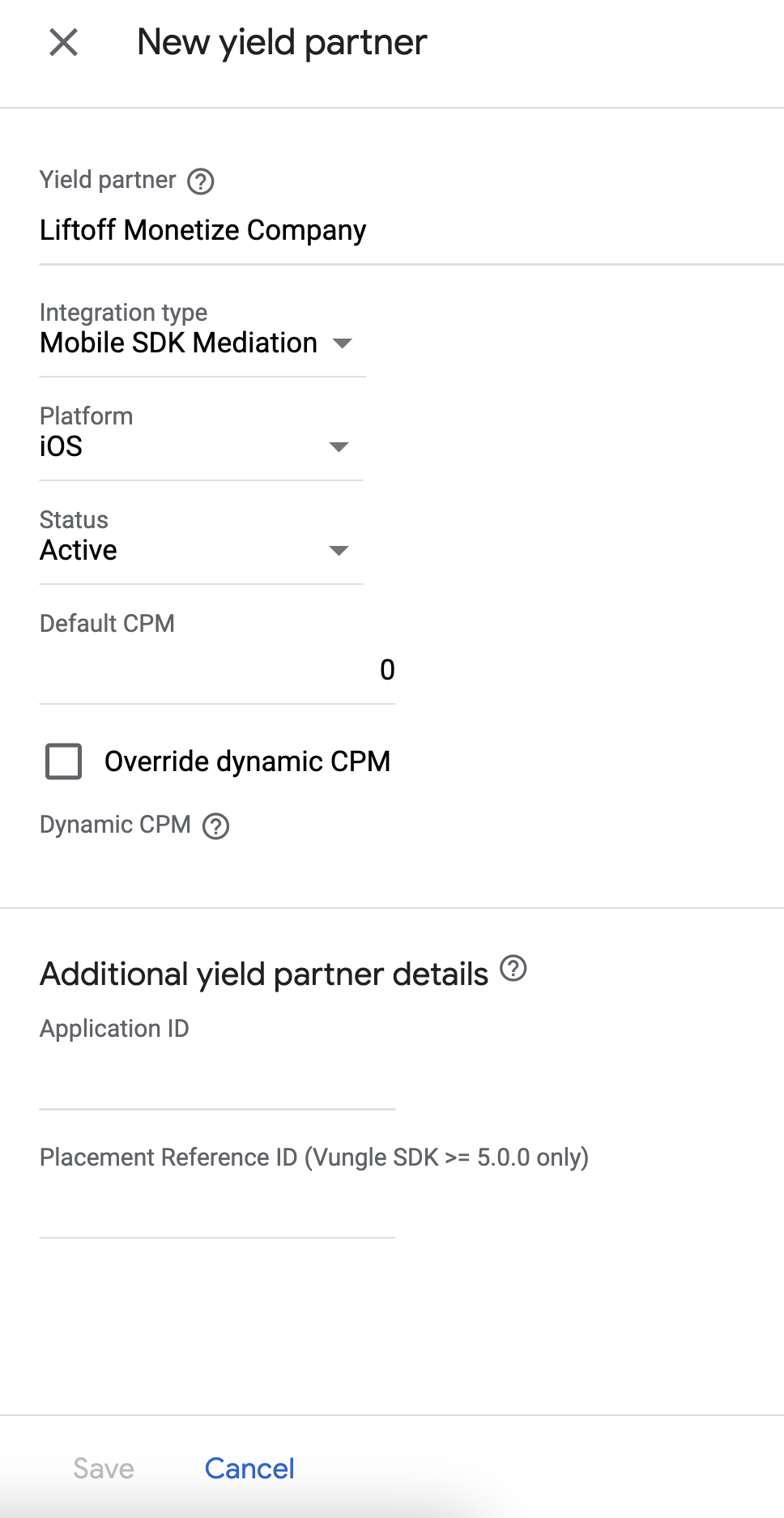 Шаг 2: Настройте запрос на монетизацию Liftoff в пользовательском интерфейсе Ad Manager.