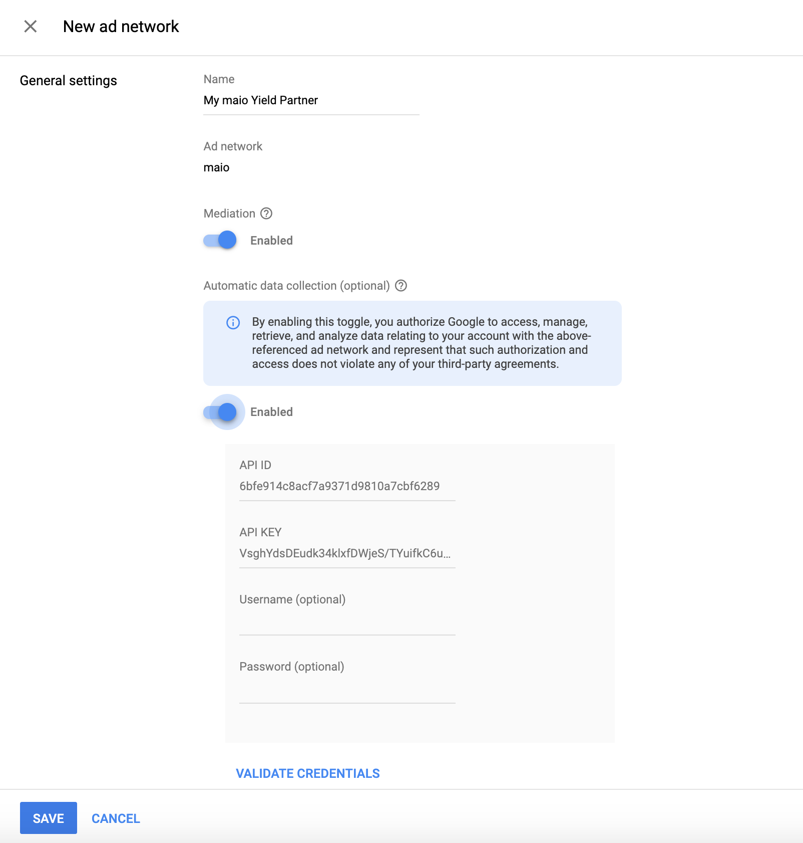 Sélectionnez maio comme Réseau publicitaire, saisissez un Nom unique et activez la Médiation.