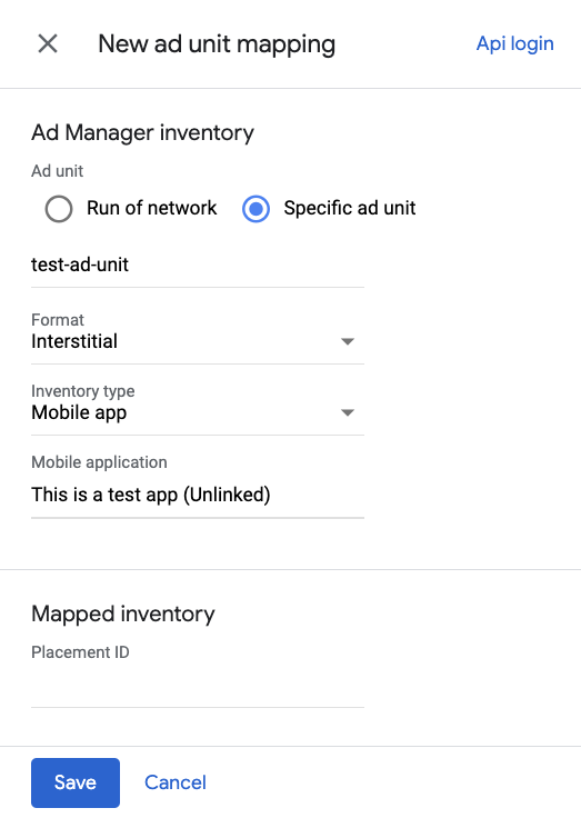 เลือกหน่วยโฆษณาที่เฉพาะเจาะจง เลือกหน่วยโฆษณาและรูปแบบ แอปบนอุปกรณ์เคลื่อนที่เป็น ประเภทพื้นที่โฆษณา และแอปพลิเคชันบนอุปกรณ์เคลื่อนที่ จากนั้นป้อนรหัสตําแหน่งที่ได้รับ ในส่วนก่อนหน้า