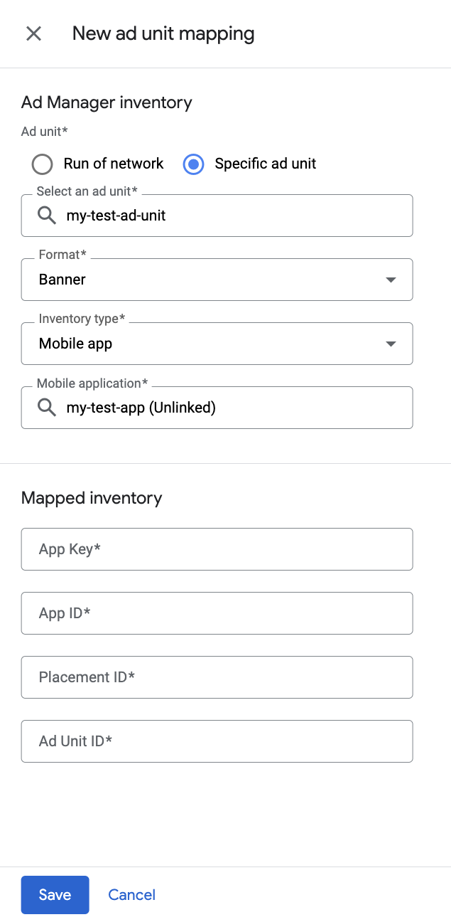 选择特定广告单元。选择广告单元和格式,选择移动应用作为广告资源类型,并选择您的移动应用。然后,输入在上一部分获得的应用密钥应用 ID展示位置 ID广告单元 ID
