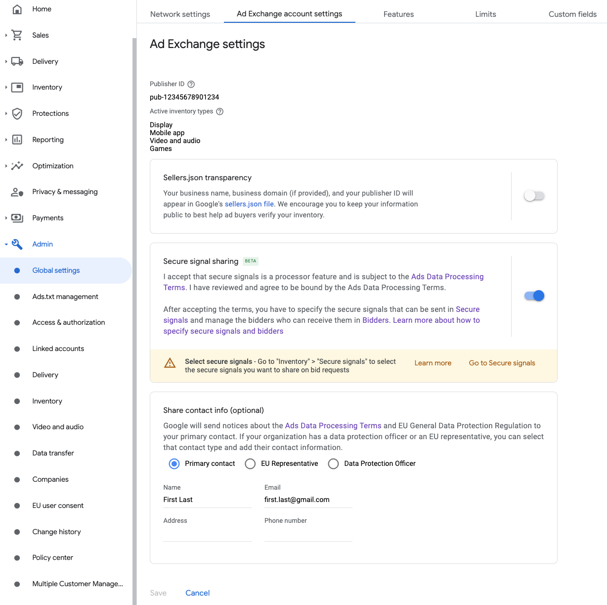एडमिन > ग्लोबल सेटिंग पर जाएं. Ad Exchange खाते की सेटिंग टैब पर जाएं. इसके बाद, सुरक्षित तरीके से सिग्नल शेयर करने की सुविधा की समीक्षा करें और इसे टॉगल करके चालू करें. सेव करें पर क्लिक करें.