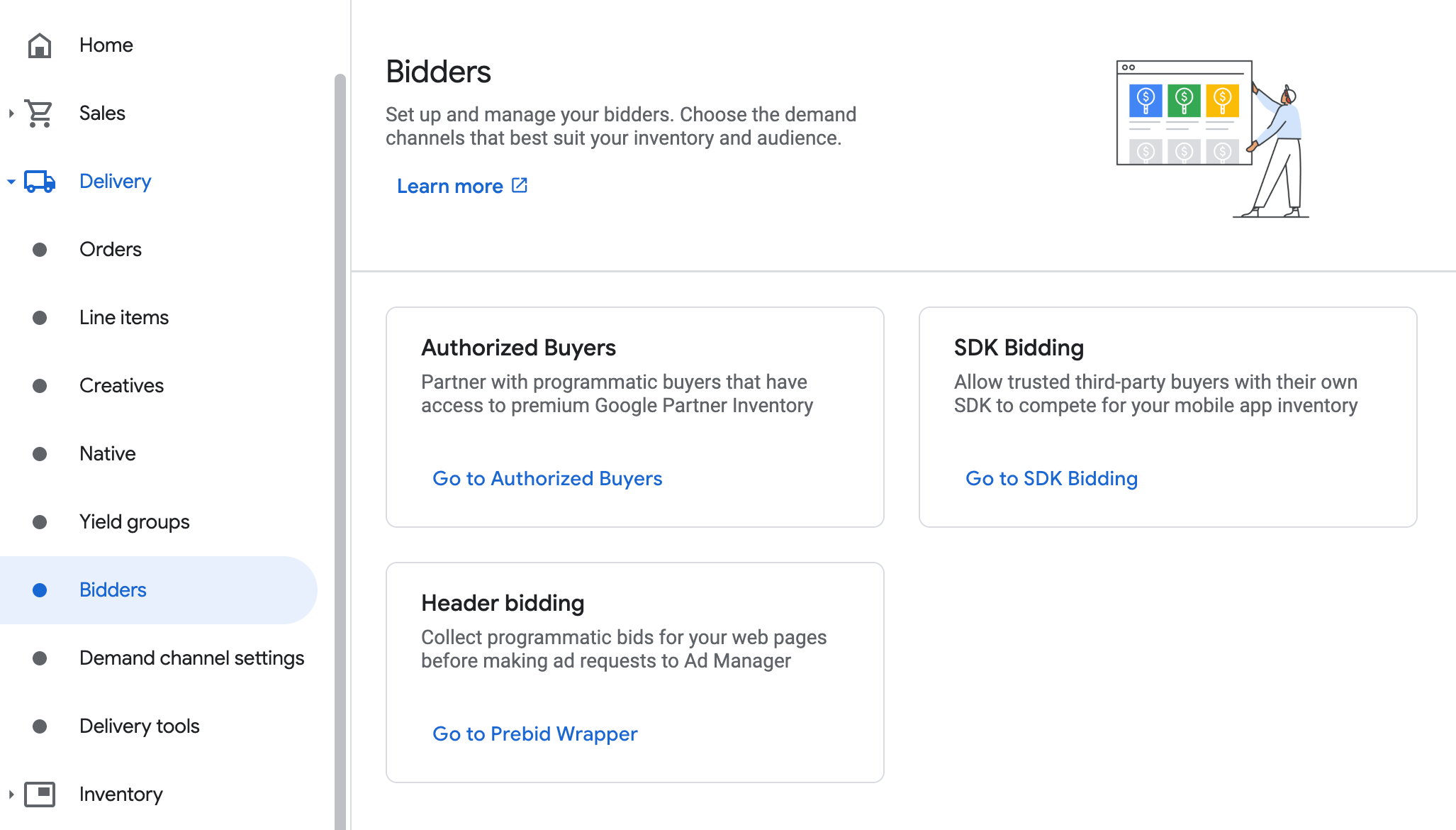 विज्ञापन डिलीवरी > बिड करने वाले पर जाएं. इसके बाद, एसडीके से बिडिंग पर जाएं पर क्लिक करें.