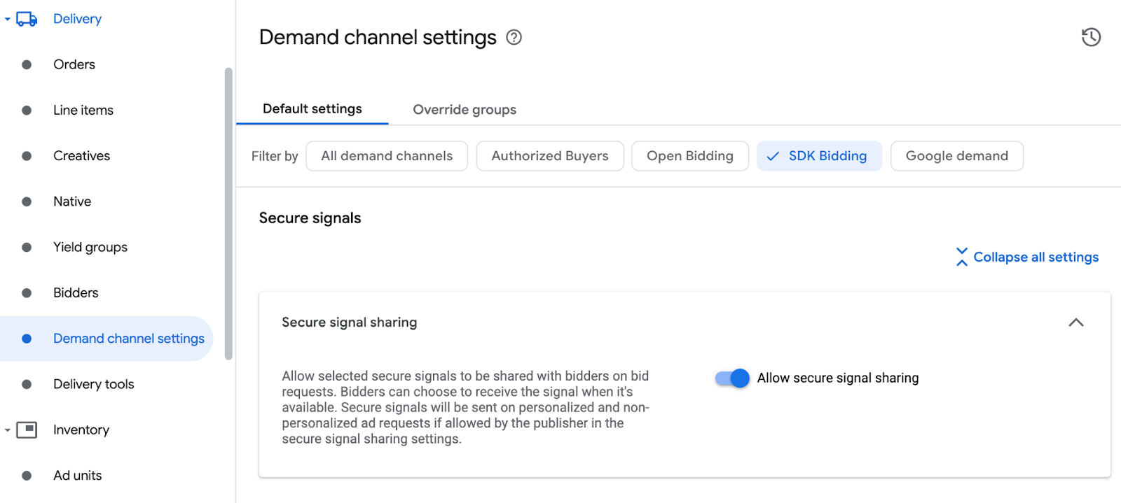 डिलीवरी > डिमांड चैनल की सेटिंग पर जाएं. डिफ़ॉल्ट सेटिंग टैब में, एसडीके से बिडिंग के लिए, सुरक्षित सिग्नल शेयर करने की अनुमति दें को टॉगल करके चालू करें.