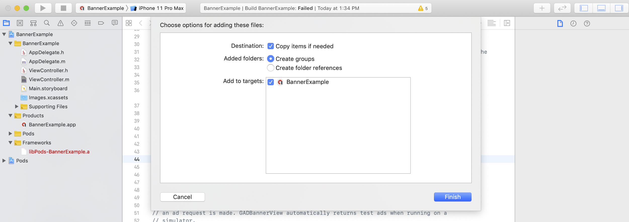จากนั้นลากเฟรมเวิร์กลงในโปรเจ็กต์ Xcode โดยตรวจสอบว่าได้เลือกคัดลอก รายการหากจำเป็น