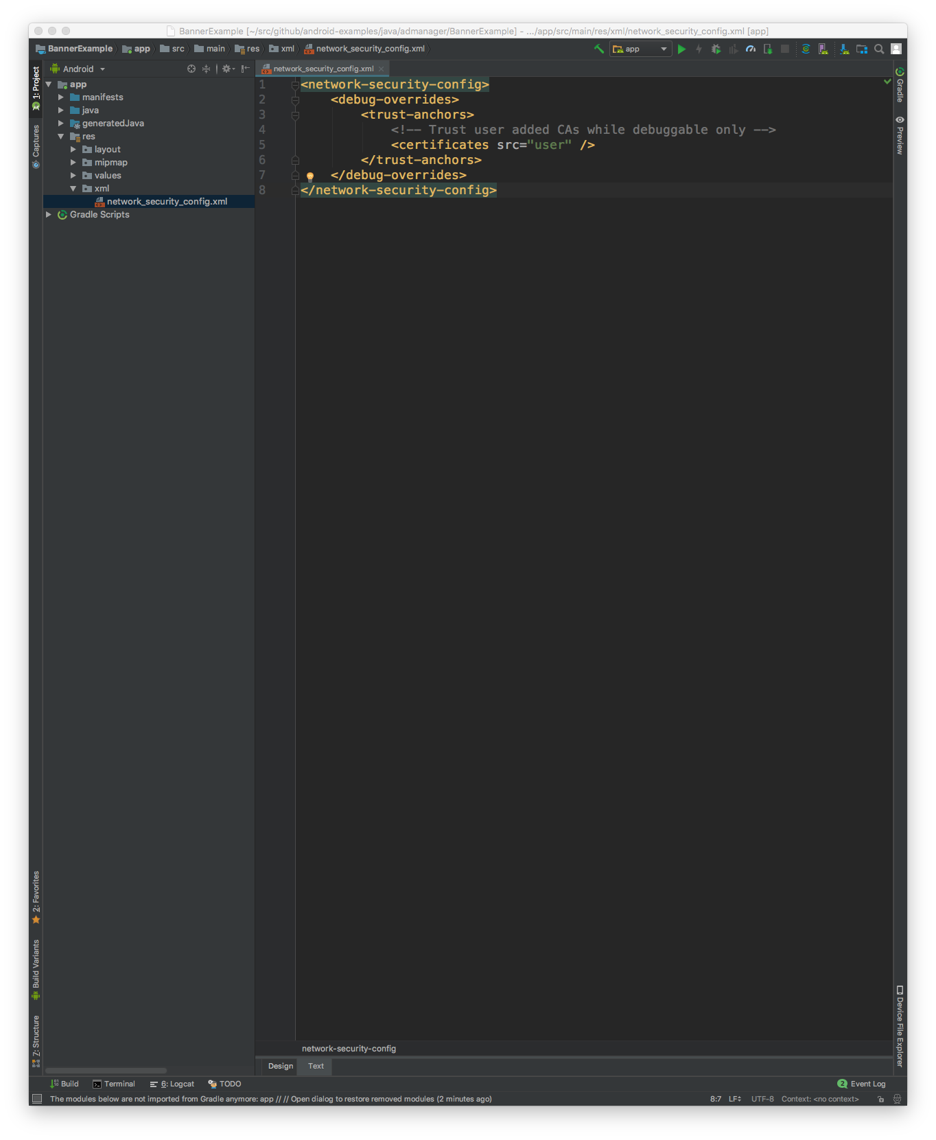 First, you will need to add a new XML resource file for Network Security Configuration under