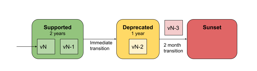 | เวอร์ชัน SDK | การเปิดตัวทั้งหมดที่มีเวอร์ชันหลัก N และ N-1 โดยที่ N คือเวอร์ชันหลักล่าสุด | ทุกรุ่นที่มีรุ่นหลัก N-2 | ทุกรุ่นที่มีรุ่นหลัก N-3 หรือต่ำกว่า รุ่นที่มีเวอร์ชันหลัก N-3 จะหยุดให้บริการประมาณ 2 เดือนหลังจากที่เวอร์ชันหลัก N ได้รับการเผยแพร่ |