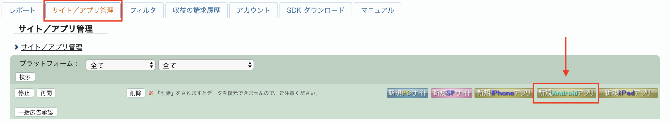 Добавьте свое приложение на панель управления i-mobile, щелкнув вкладку «サイト/アプリ管理» (Управление сайтом/приложением) и кнопку, соответствующую платформе вашего приложения.