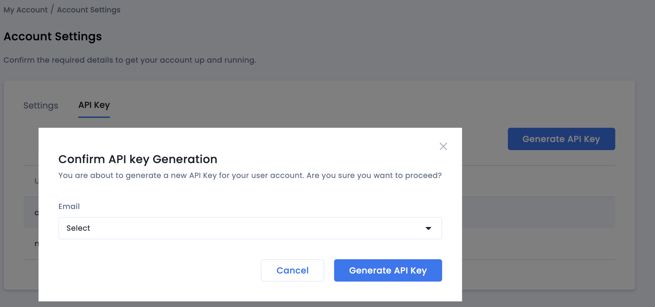انتقِل إلى حسابي > إعدادات الحساب. انتقِل إلى علامة التبويب مفتاح واجهة برمجة التطبيقات وانقر على إنشاء مفتاح واجهة برمجة التطبيقات.