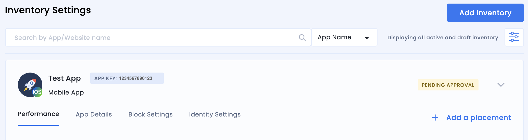 To add your app to the InMobi dashboard, click Inventory > Inventory Settings.