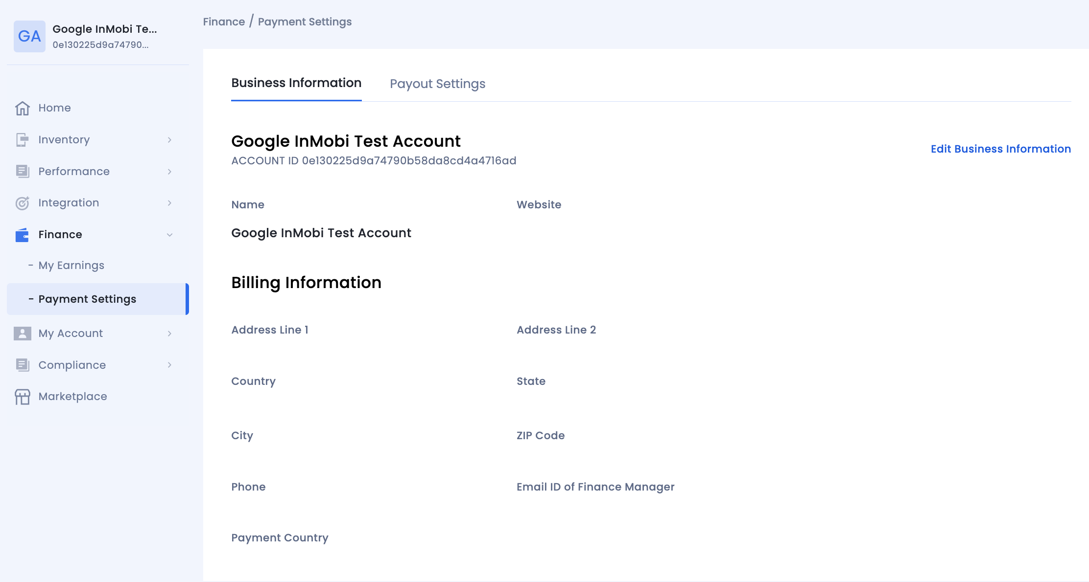 InMobi 계정 ID는 Finance(재무) > Payment Settings(지급 설정) > Payment Information(지급 정보)에서 확인할 수 있습니다.