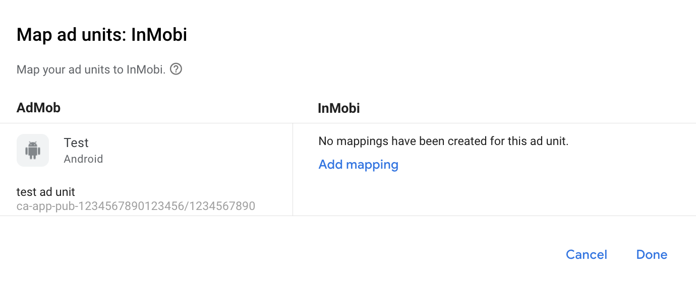 หากมีการแมปสำหรับ InMobi อยู่แล้ว คุณก็เลือกการแมปนั้นได้ หากไม่ ให้คลิกเพิ่มการแมป