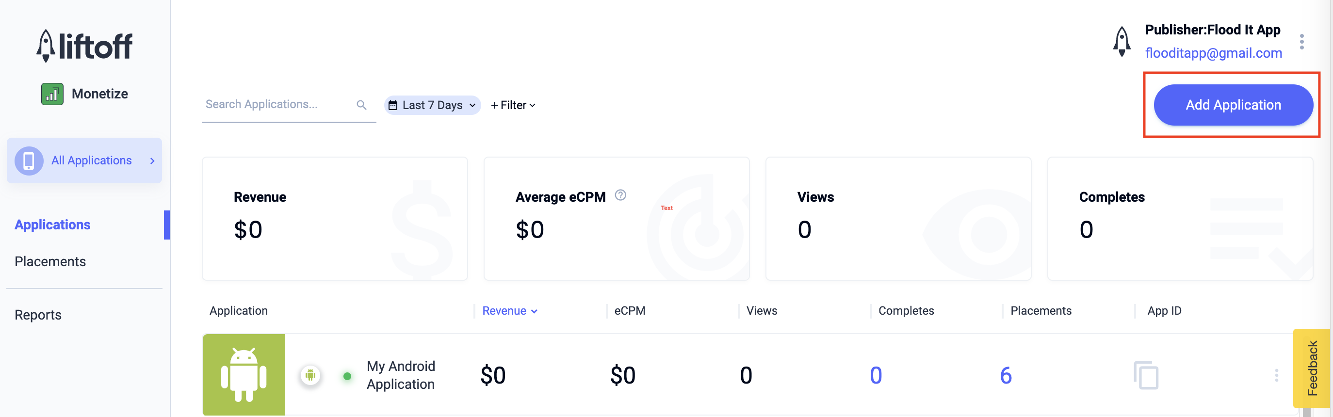 Ajoutez votre application au tableau de bord Liftoff Monetize en cliquant sur le bouton Add Application (Ajouter une application).