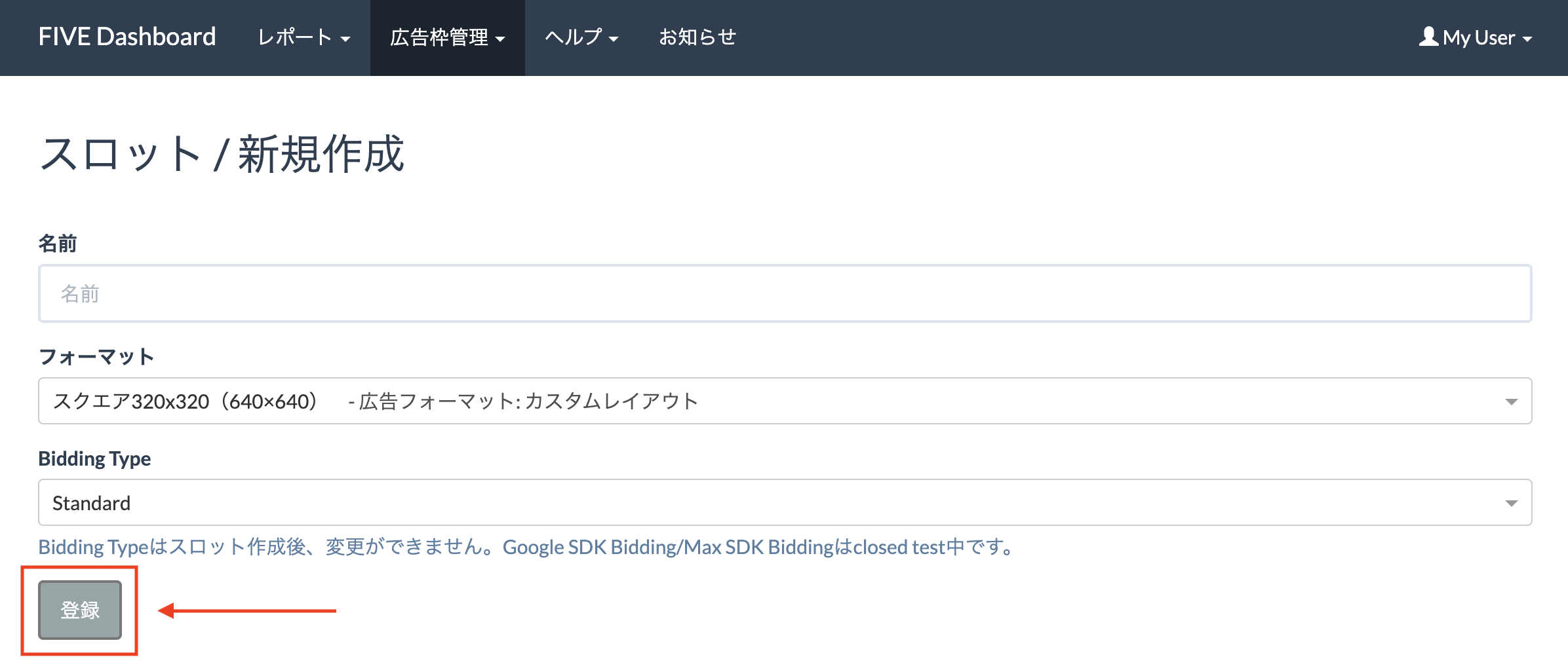 Wypełnij formularz, aby podać szczegóły dotyczące miejsca. W sekcji Typ określania stawek wybierz Standardowe, aby skonfigurować to miejsce na potrzeby zapośredniczenia kaskadowego, lub Określanie stawek przez pakiet SDK Google, aby skonfigurować to miejsce na potrzeby określania stawek. Po wypełnieniu formularza kliknij 登録 (Zarejestruj).