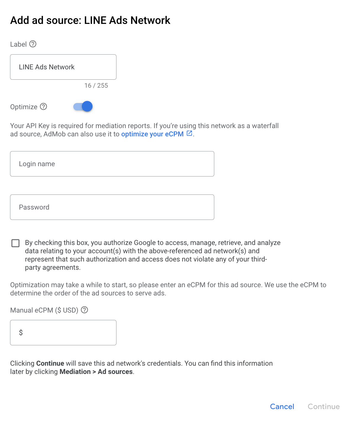 LINE Ads Network को चुनें और ऑप्टिमाइज़ करें स्विच को चालू करें. LINE Ads Network के लिए विज्ञापन सोर्स ऑप्टिमाइज़ेशन सेट अप करने के लिए, पिछले सेक्शन में मिला लॉगिन का नाम और पासवर्ड डालें. इसके बाद, LINE Ads Network के लिए ईसीपीएम वैल्यू डालें और जारी रखें पर क्लिक करें.