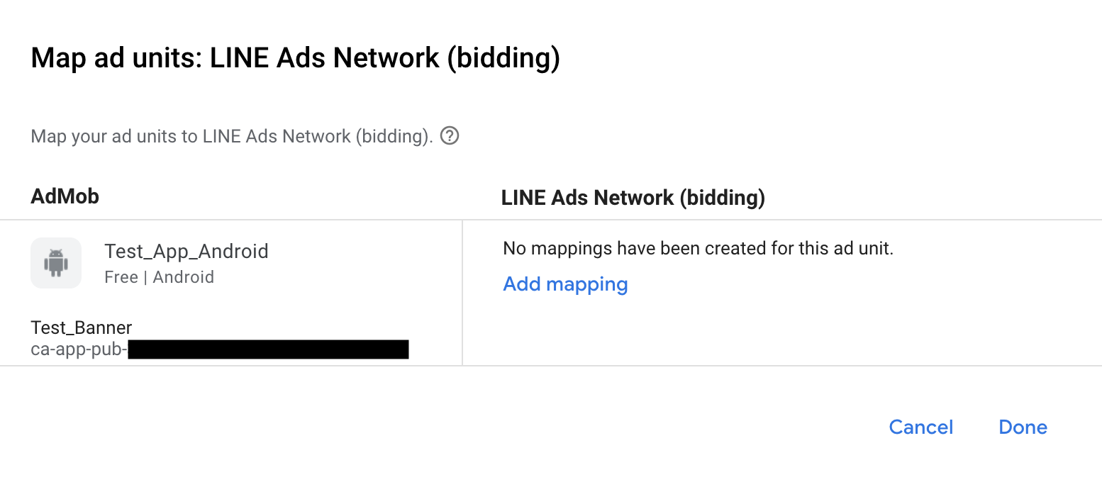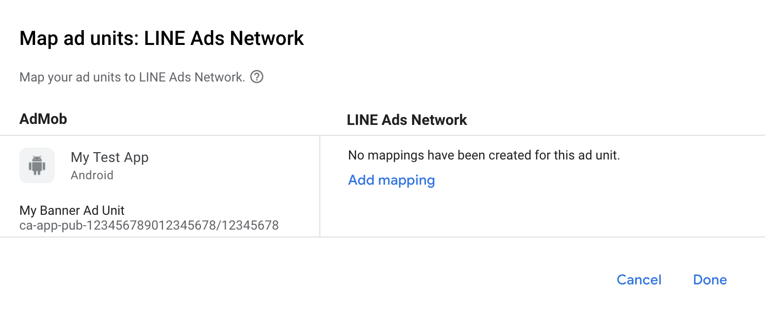 अगर आपने LINE Ads Network को पहले से विज्ञापन सोर्स के तौर पर जोड़ा हुआ है, तो उसे चुना जा सकता है. अगर ऐसा नहीं है, तो मैपिंग जोड़ें पर क्लिक करें.
