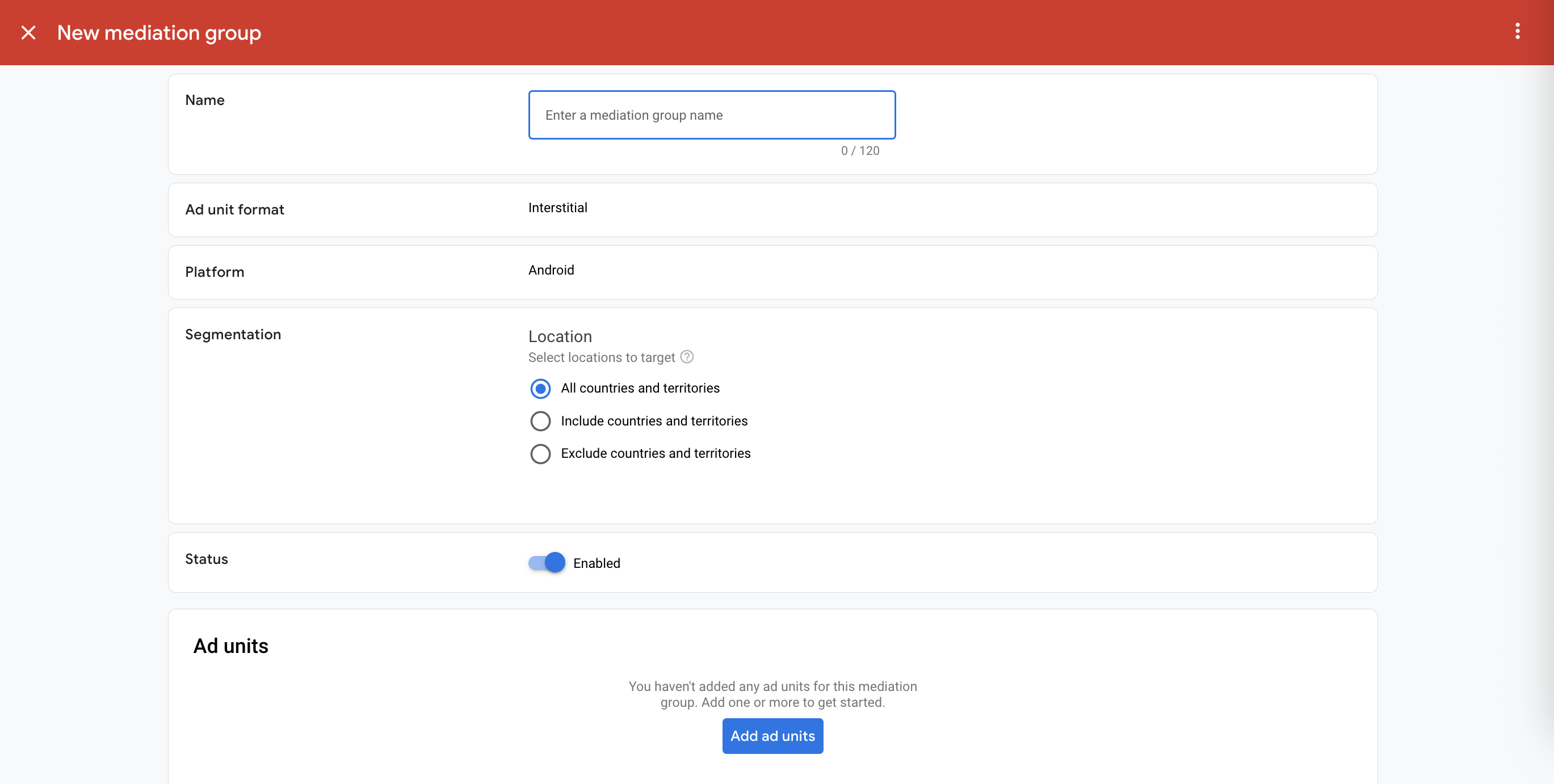 Присвойте вашей группе посредничества название и выберите регионы для таргетирования. Затем установите статус группы посредничества на «Включено» и нажмите «Добавить рекламные блоки» .