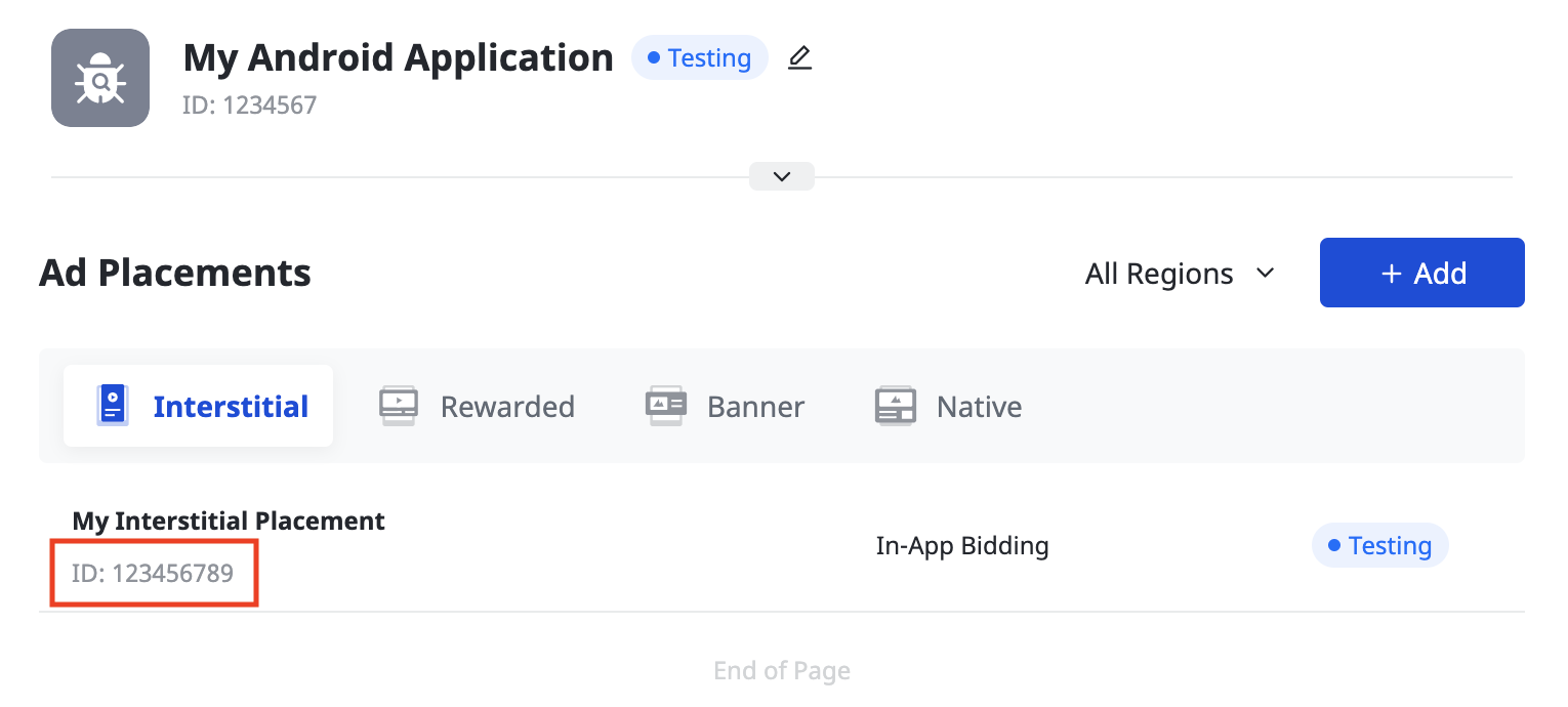 Setelah aplikasi Anda dibuat, klik tombol Tambahkan untuk membuat penempatan iklan.