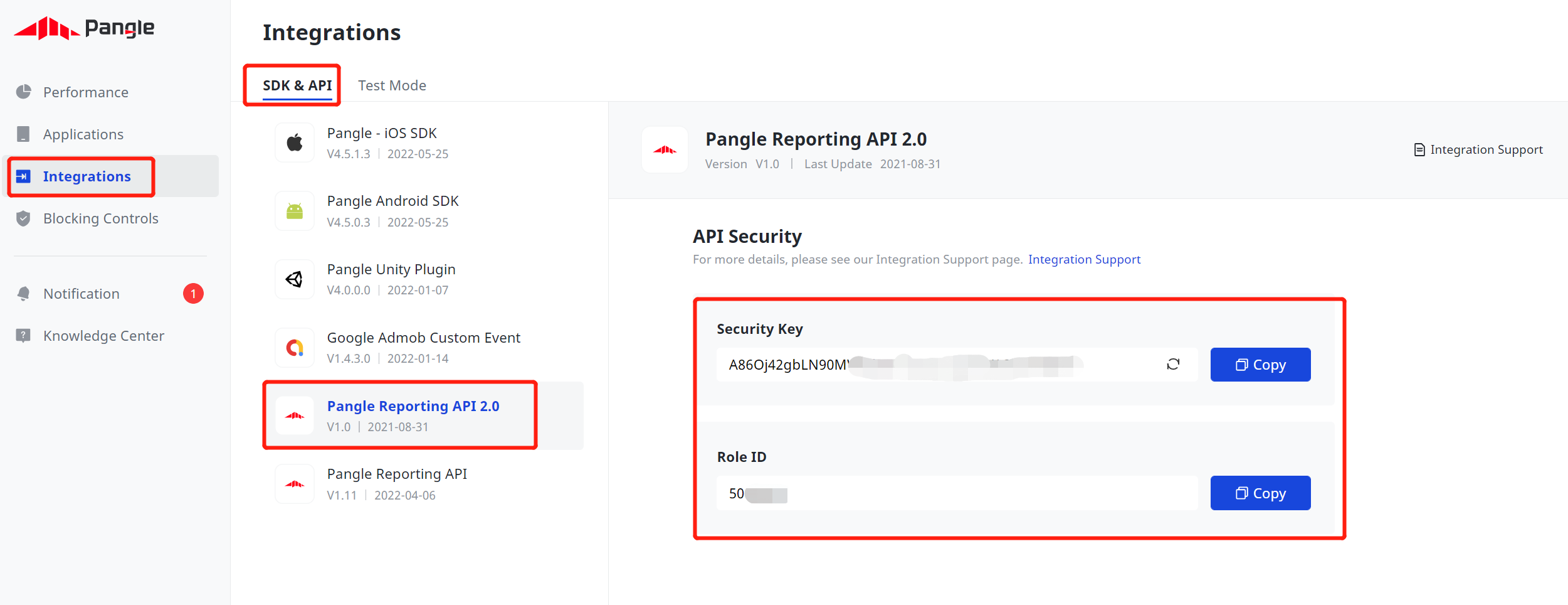 คลิกการผสานรวม > SDK และ API > Pangle Reporting API 2.0 จดรหัสบทบาทและคีย์ความปลอดภัยไว้