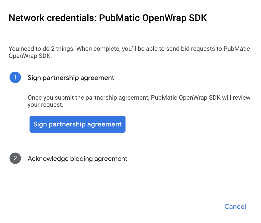 [パートナー契約への署名手順] をクリックし、PubMatic OpenWrap SDK との入札のパートナーシップを設定します。