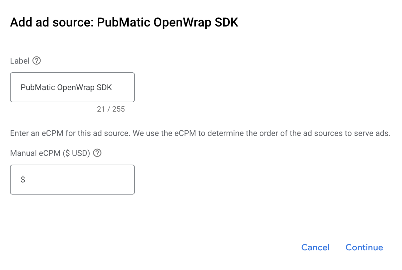 Selecione SDK OpenWrap da PubMatic. Em seguida, insira um valor de eCPM para o SDK OpenWrap da PubMatic e clique em Continuar.