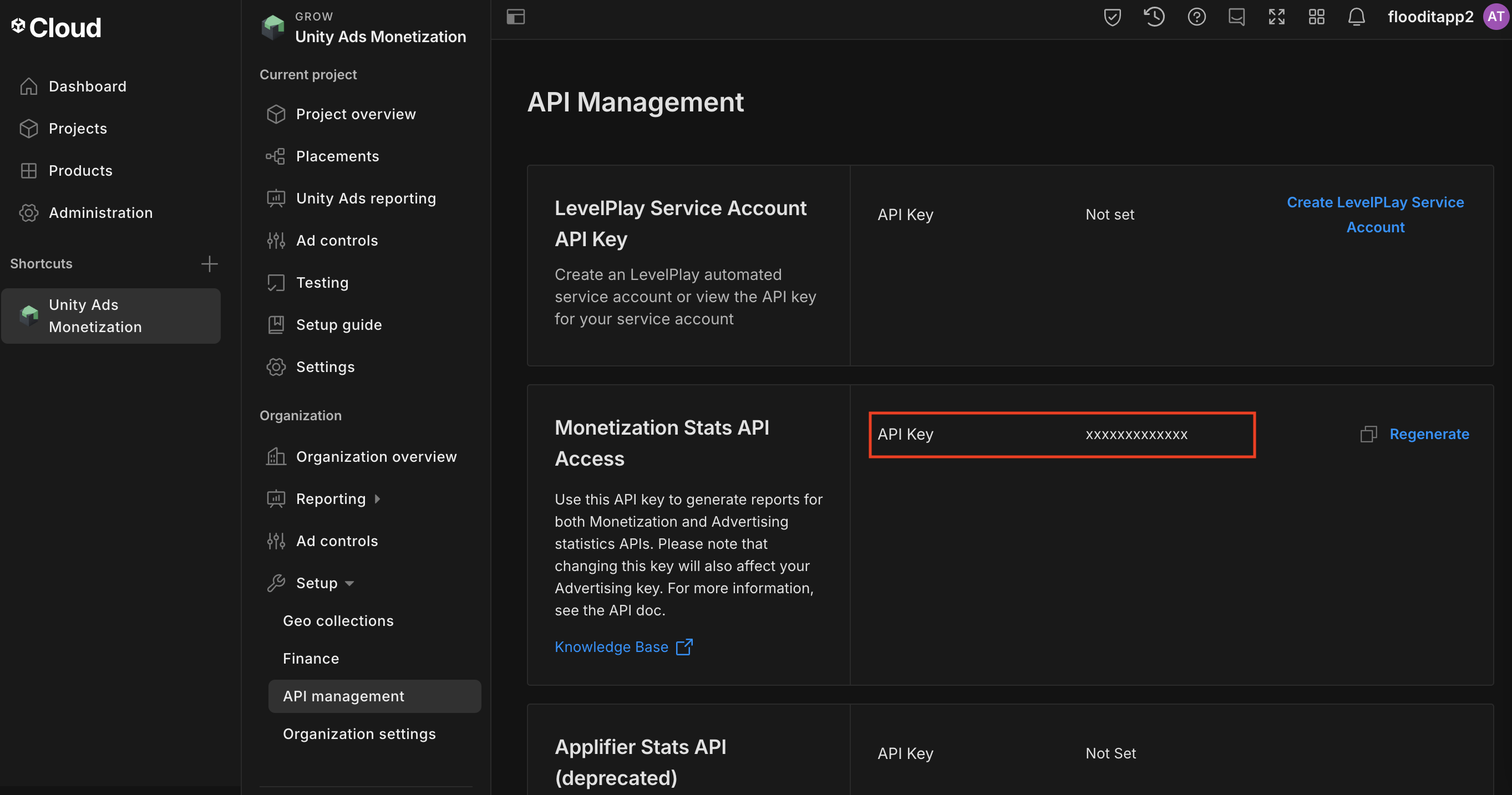 Unity Ads Monetization(Unity Ads 수익 창출) > API management(API 관리)로 이동하여 Monetization Stats API Access(Monetization Stats API 액세스)의 API Key(API 키)를 기록해 둡니다.