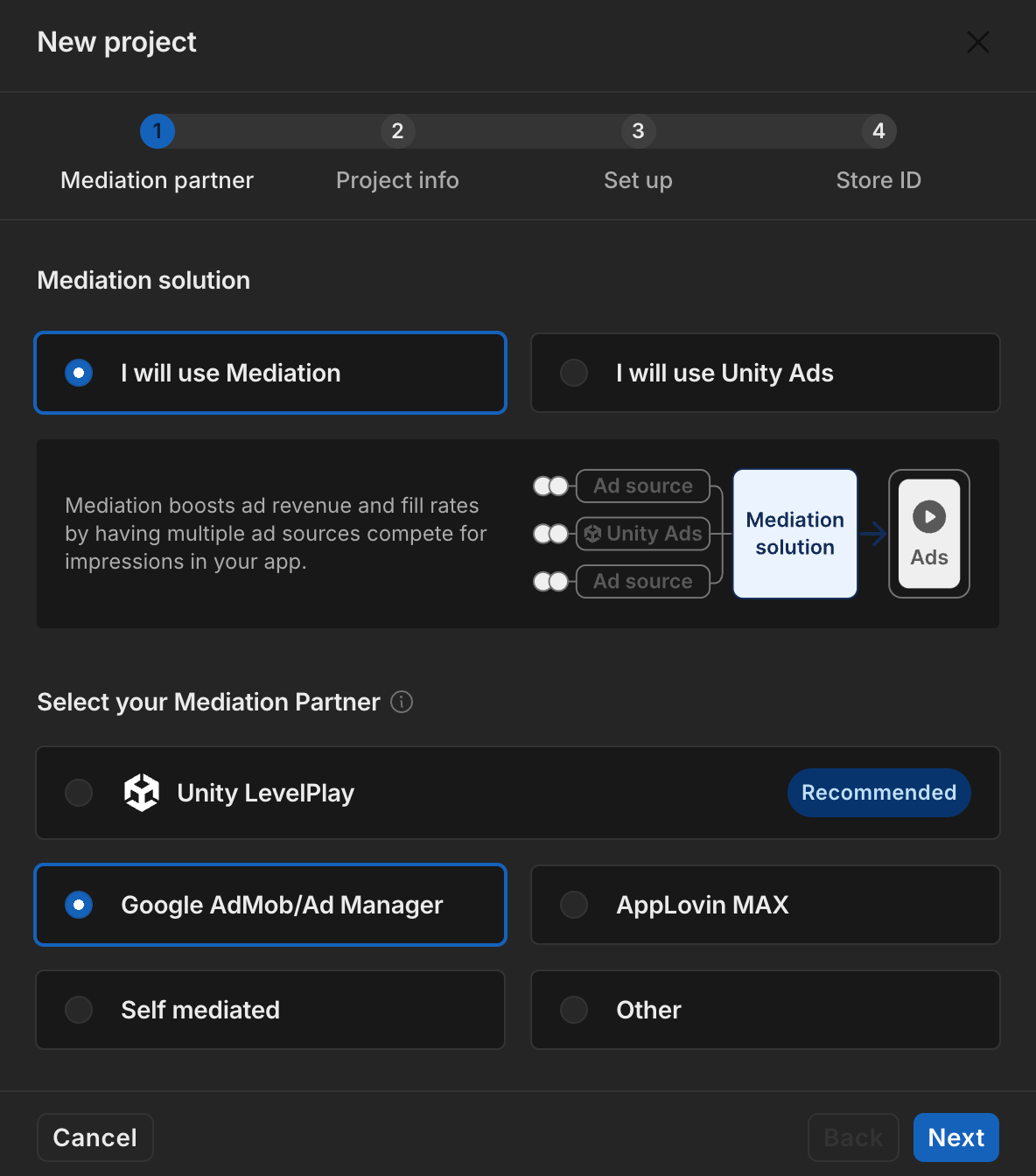 New Project(새 프로젝트) 모달에서 I will use Mediation(미디에이션 사용)을 선택하고 Mediation Partner(미디에이션 파트너)로 Google Admob을 선택한 다음 Next(다음)를 클릭합니다.