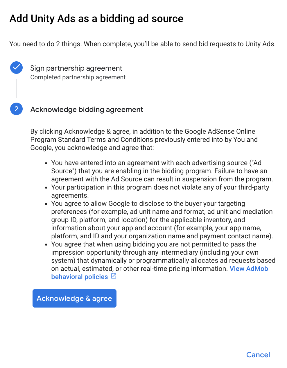 คลิกวิธีลงนามในข้อตกลงสำหรับพาร์ทเนอร์และ ตั้งค่าการเป็นพาร์ทเนอร์การเสนอราคากับ Unity Ads