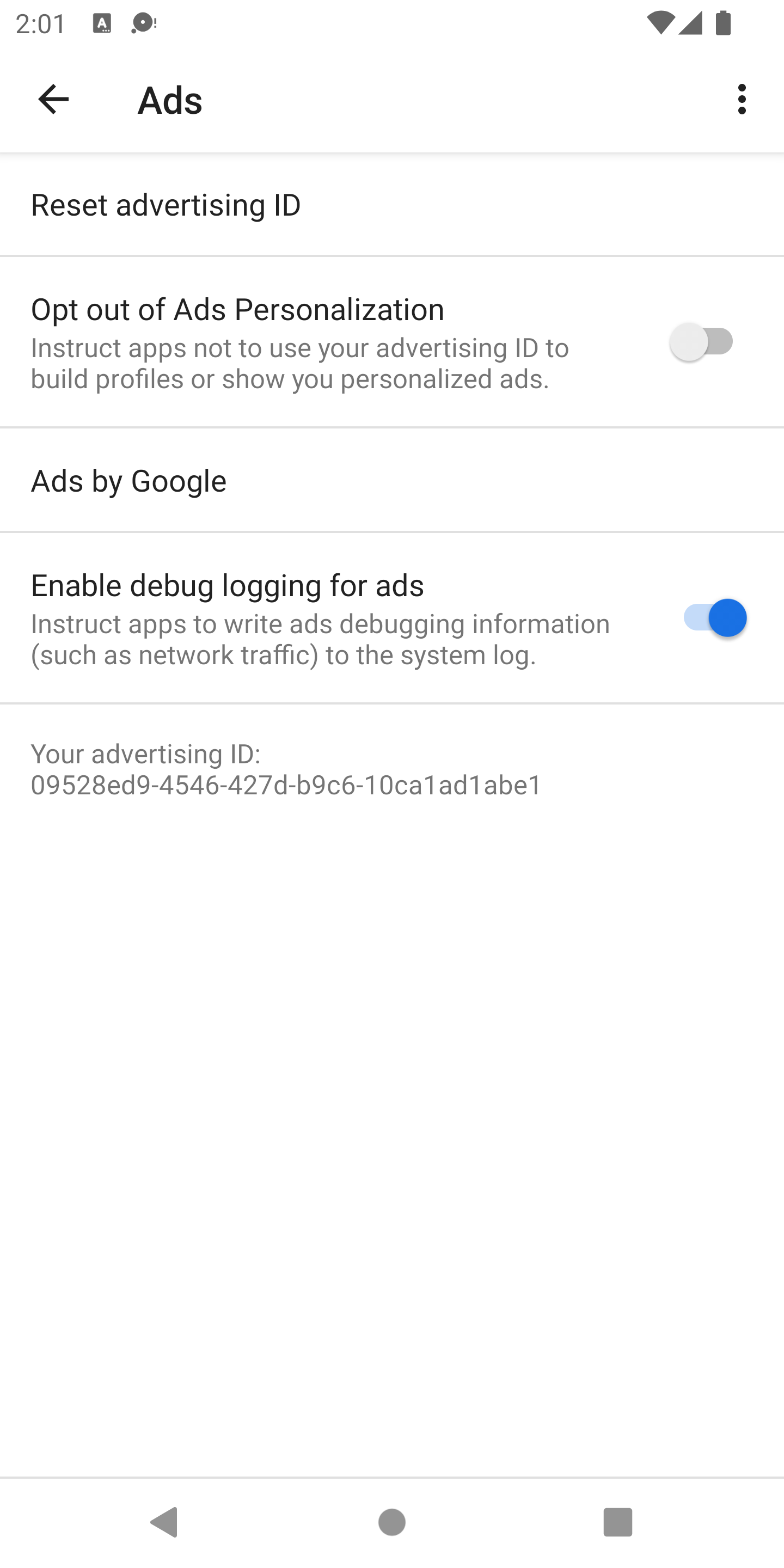Enable tracing through developer options in the Google Settings app, selecting "Ads" and then "Enable debug logging for ads".